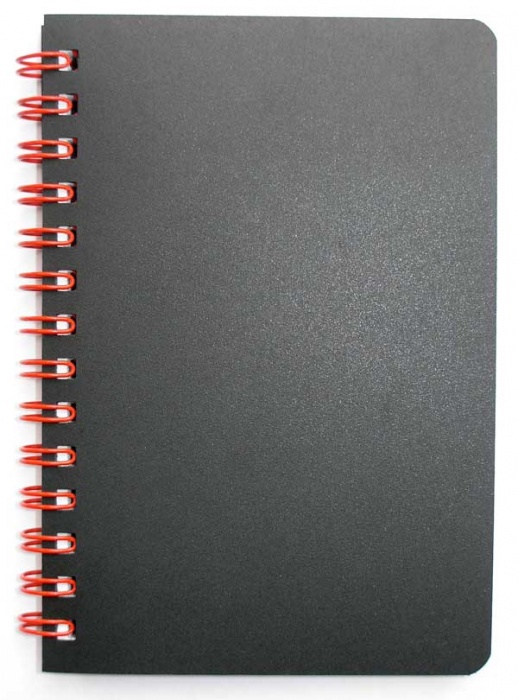 Записная книжка с пластиковой обложкой и пружинным переплетом.