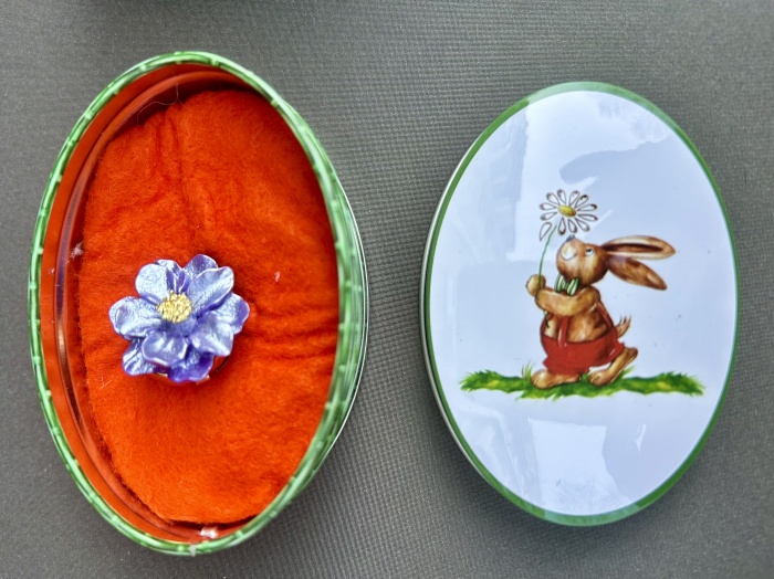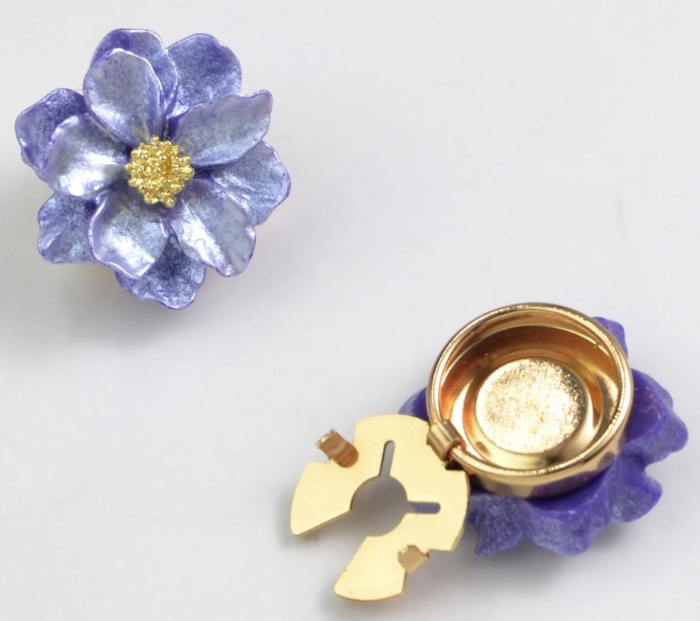 Откройте металлическую застежку с обратной стороны броши, наденьте на пуговицу через прорези и защелкните сверху. Ваша накладка — брошь на пуговицу готова.
