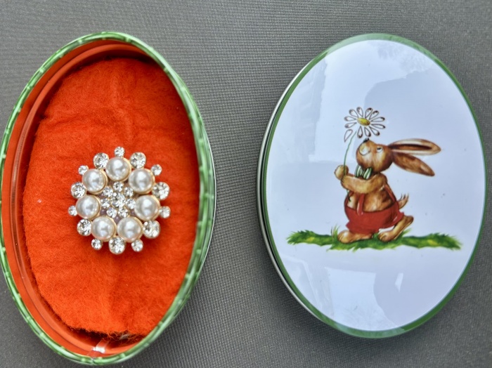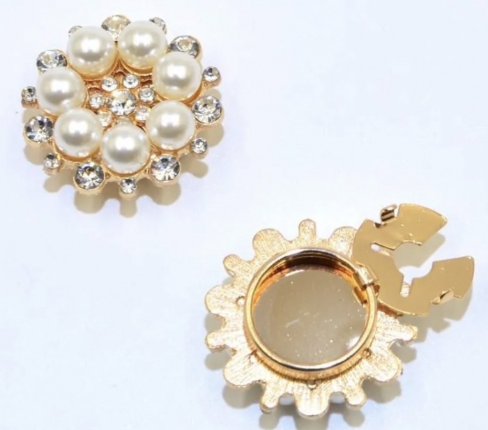 Откройте металлическую застежку с обратной стороны броши, наденьте на пуговицу через прорези и защелкните сверху. Ваша накладка — брошь на пуговицу готова.