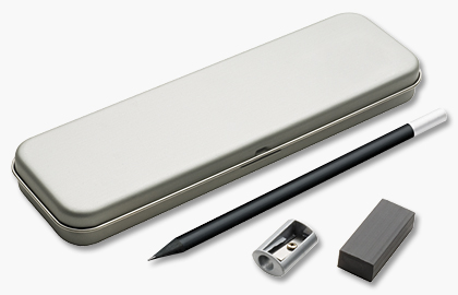 Набор состоит из алюминиевого бокса, 6 чернографитовых карандашей с серебряным наконечником, ластика и точилки. |