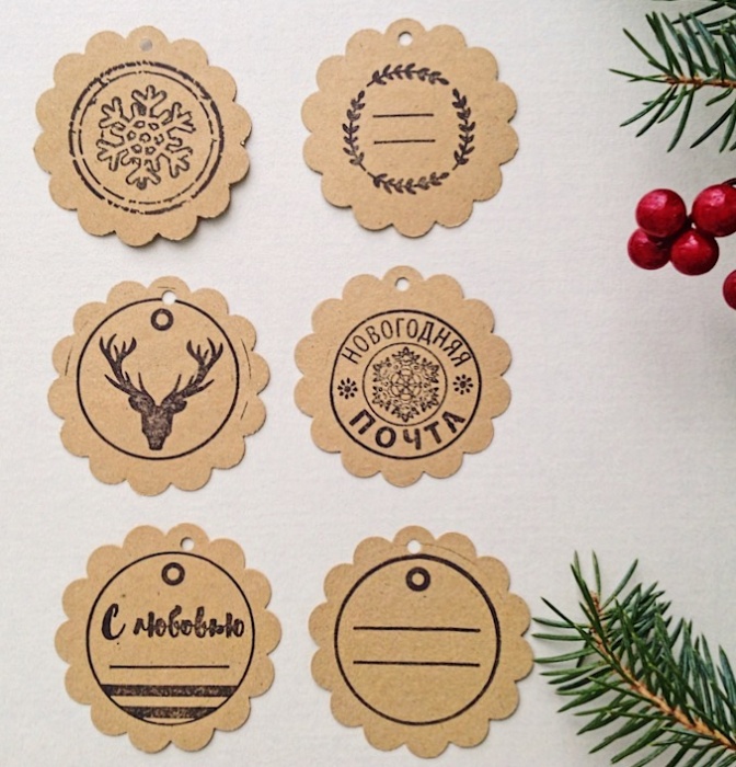 Новогодние крафтбирочки, бумага, круглые с вырубкой, диаметр 4,5 см. С надписями, в ассортименте.
